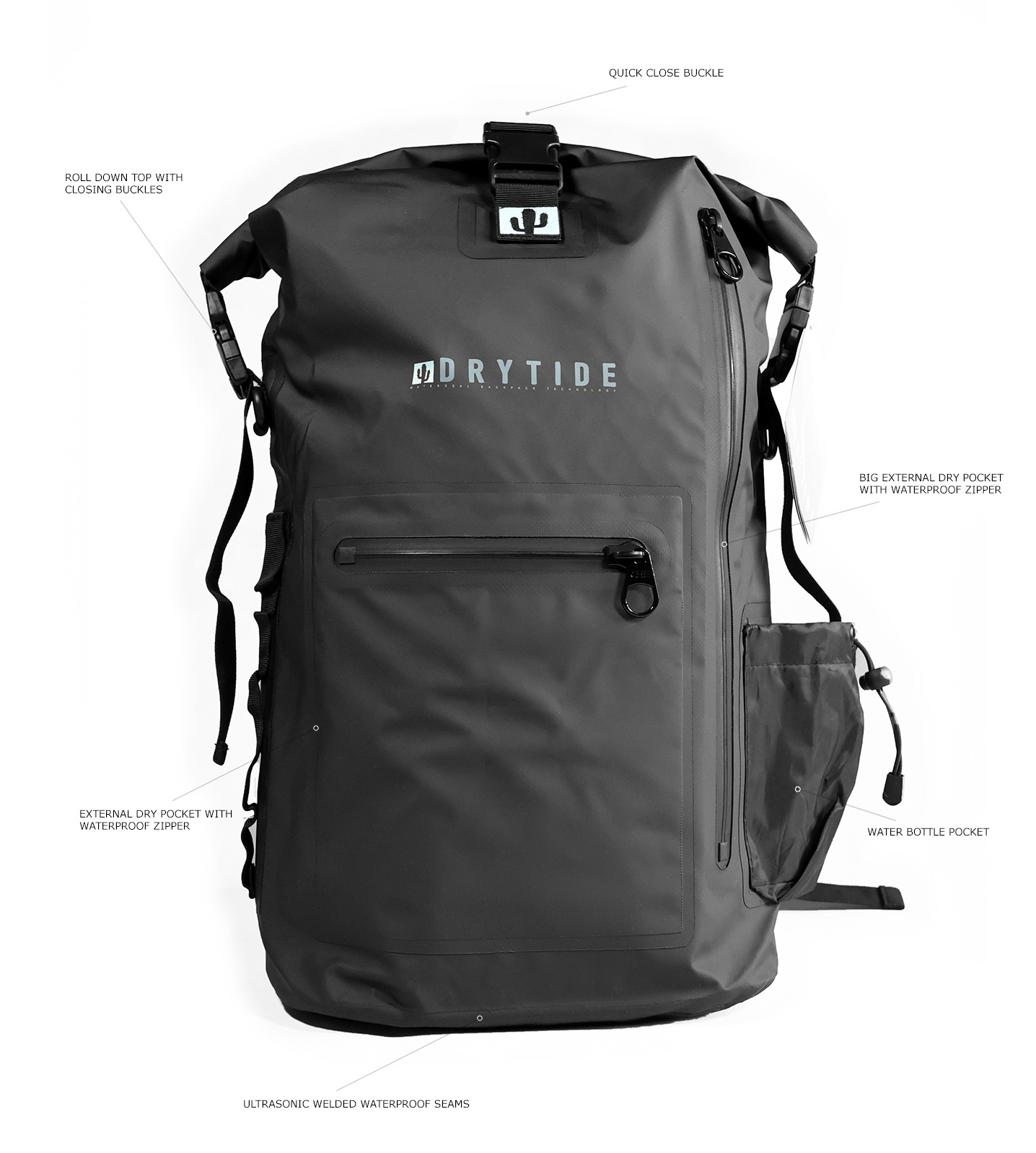 Nahrbtnik je narejen iz trpežnega 100% vodotesnega materiala in vaše stvari bodo v njem ostale suhe ne samo med kratko ploho ampak tudi v mnogo bolj ekstremnih razmerah kot so močni tropski nalivi, med različnimi vodnimi športi kot so kajak, rafting, sup, jadranje, vožnja s čolnom ali jet ski-jem in podobno. Oznaka vodotesno se dandanes pojavlja na celi vrsti izdelkov in nahrbtnikov, a le redko pomeni to, kar pomeni pri DryTide nahrbtnikih. Da lahko nahrbtnik dejansko pade v vodo, pa vsebina nahrbtnika vseeno ostane suha.